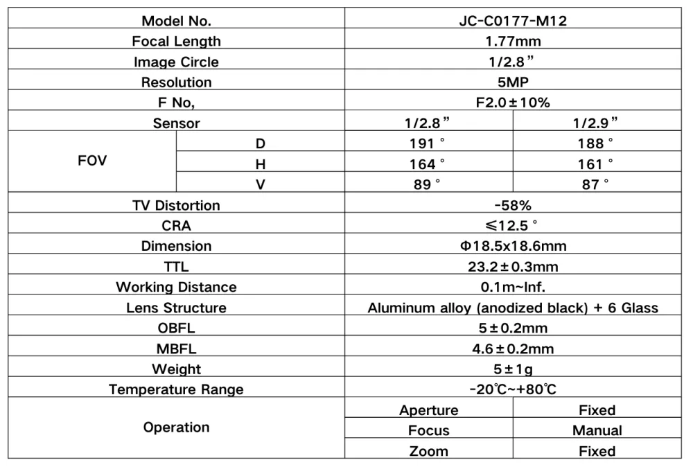 1/2.8″ | 1.77mm | F2.0±10%| M12-Mount | – 5MP M12 Lens