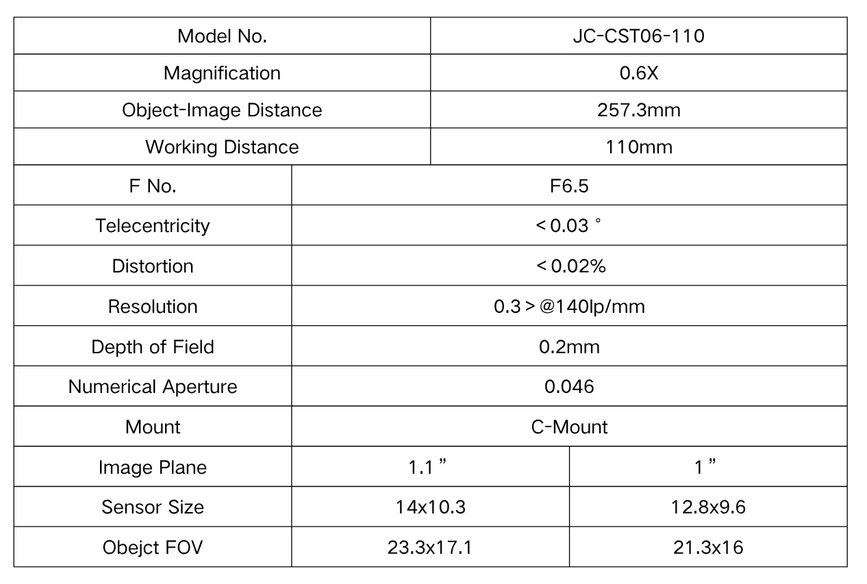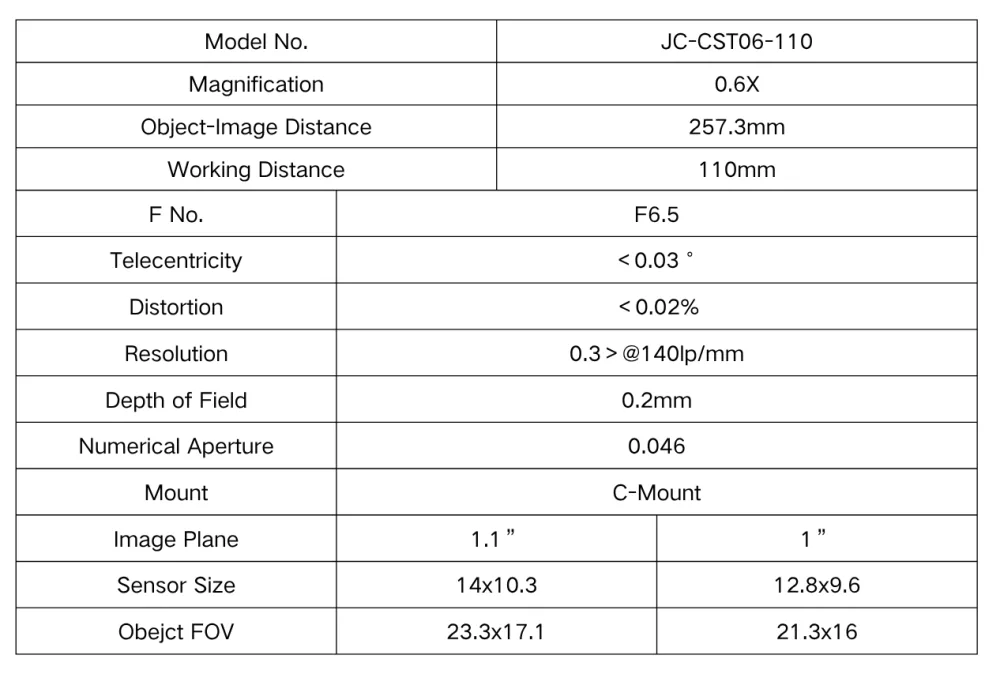 1.1″ | 0.6X | F6.5 | 0.2mm – Telecentric Lens