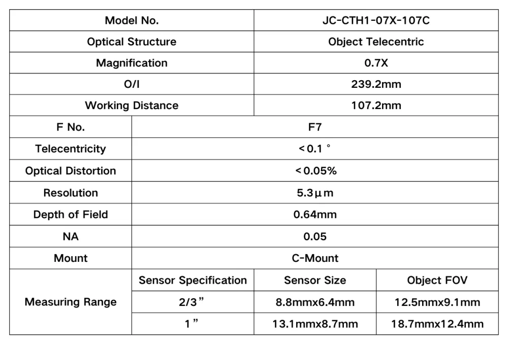 1″ | 0.7X | F7 | 0.64mm – Object Telecentric Lens