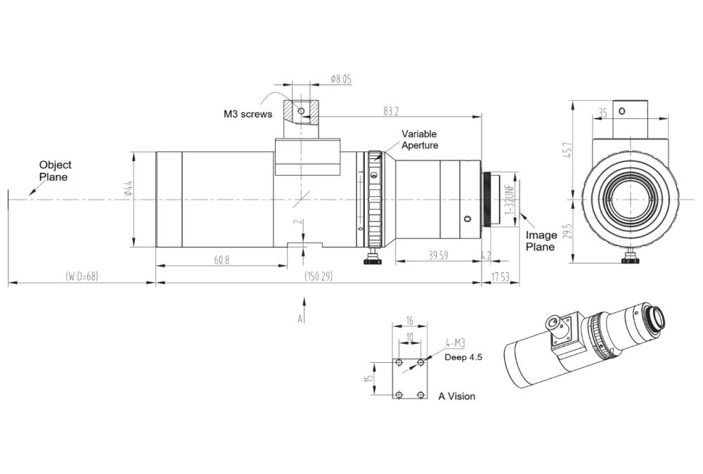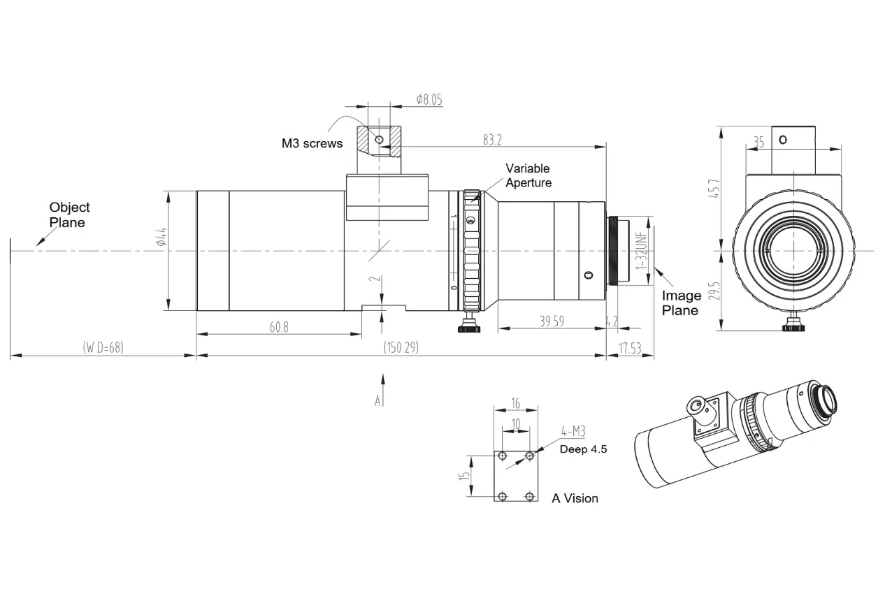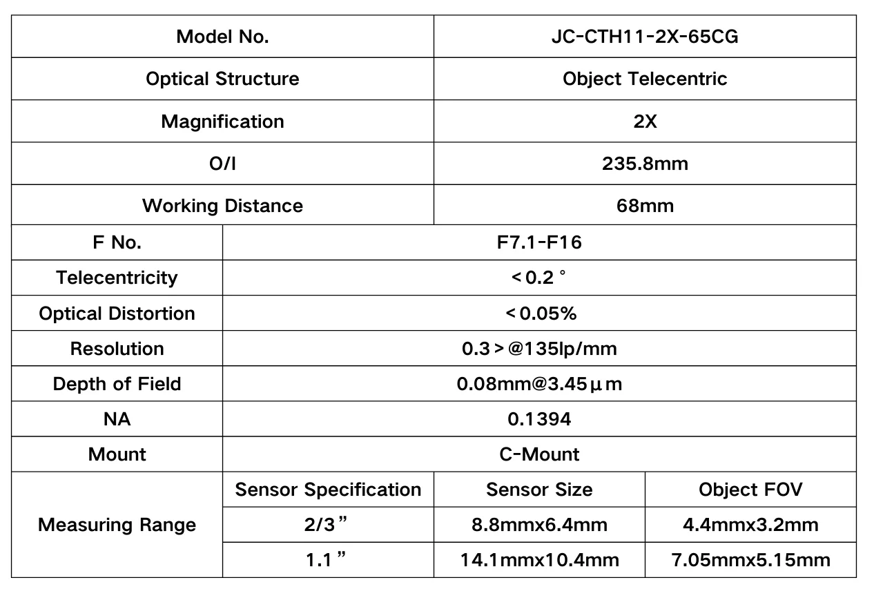 1.1″ | 2X | F7.1-F16 | 0.08mm@3.45μm – Object Telecentric Lens