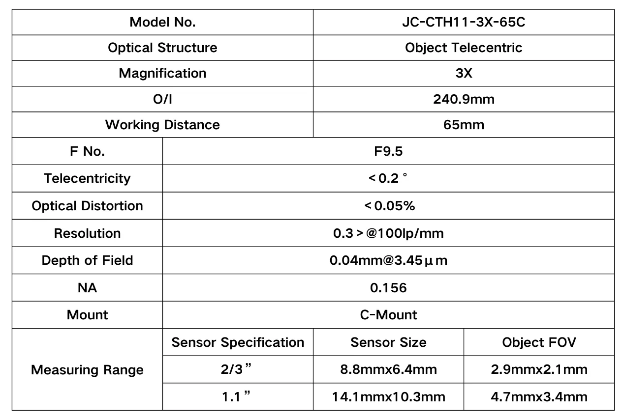 1.1″ | 3X | F9.5 | 0.4mm@3.45μm – Object Telecentric Lens