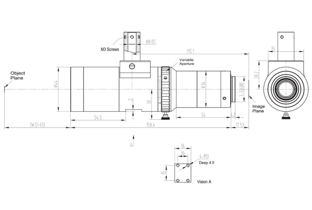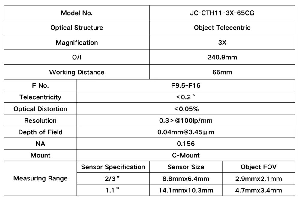1.1″ | 3X | F9.5-F16 | 0.04mm@3.45μm – Object Telecentric Lens