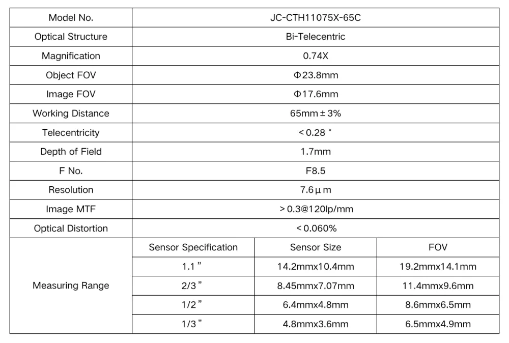 Φ23.8mm | 0.74X | F8.5 | 1.7mm – Bi-Telecentric Lens