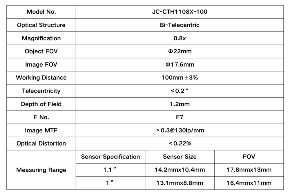 1.1″ | 0.8X | F7 | 1.2mm – Bi-Telecentric Lens