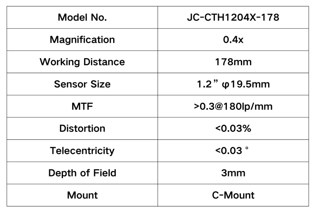 1.2″ | 0.4X | 3mm | C-Mount – Telecentric Lens