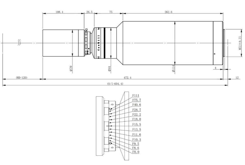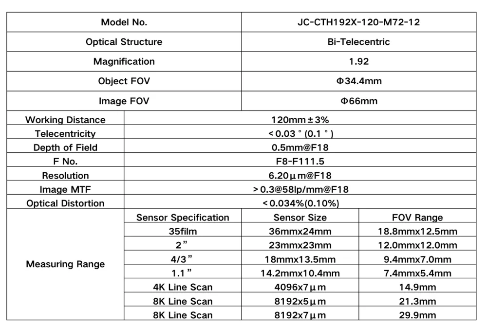 120mm±3% | 1.92X | F8-F111.5 | 0.5mm@F18 – Line Scan Bi-Telecentric Lens