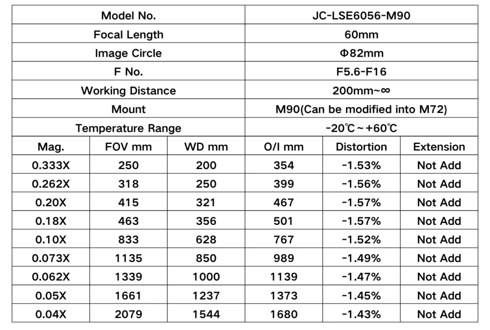 *Line scan and large format lenses need to be matched with adapter rings and extension rings according to the camera sensor size, camera mount thread size and shooting field of view. Please contact our sales staff to confirm the parameters. Thank you!
